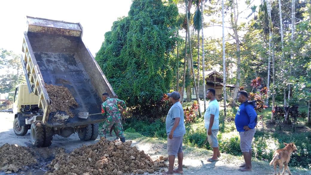WAROPEN-Dalam semangat kebersamaan dan kepedulian terhadap lingkungan, Babinsa Koramil 1709-03/Warbah, Koptu Zainal Saparang, bersama warga Kampung Sawara Jaya melaksanakan kegiatan penimbunan jalan yang rusak di Jalur 5 SP 6, Distrik Waropen Bawah, Kabupaten Waropen.Selasa(10/06/2025).