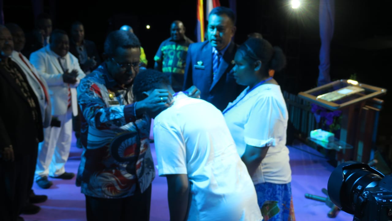 Penyematan tanda peserta youth Camp GPdI oleh Bupati Waropen F. X Mote.