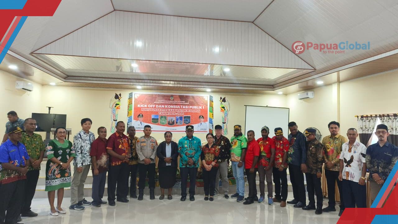 Waropen, PapuaGlobal.Com |Bupati Waropen, Fransiscus Xaverius Mote, M.Si., secara resmi membuka Kick Off dan Konsultasi Publik Pertama Penyusunan Rencana Tata Ruang Wilayah (RTRW) Kabupaten Waropen periode 2025-2045 pada Kamis, 11 September 2025. Acara ini berlangsung di Aula Alfonso Widuri dan dihadiri oleh berbagai pihak, mulai dari pimpinan Organisasi Perangkat Daerah (OPD), instansi vertikal, hingga perwakilan kelompok pemuda dan tokoh masyarakat adat.