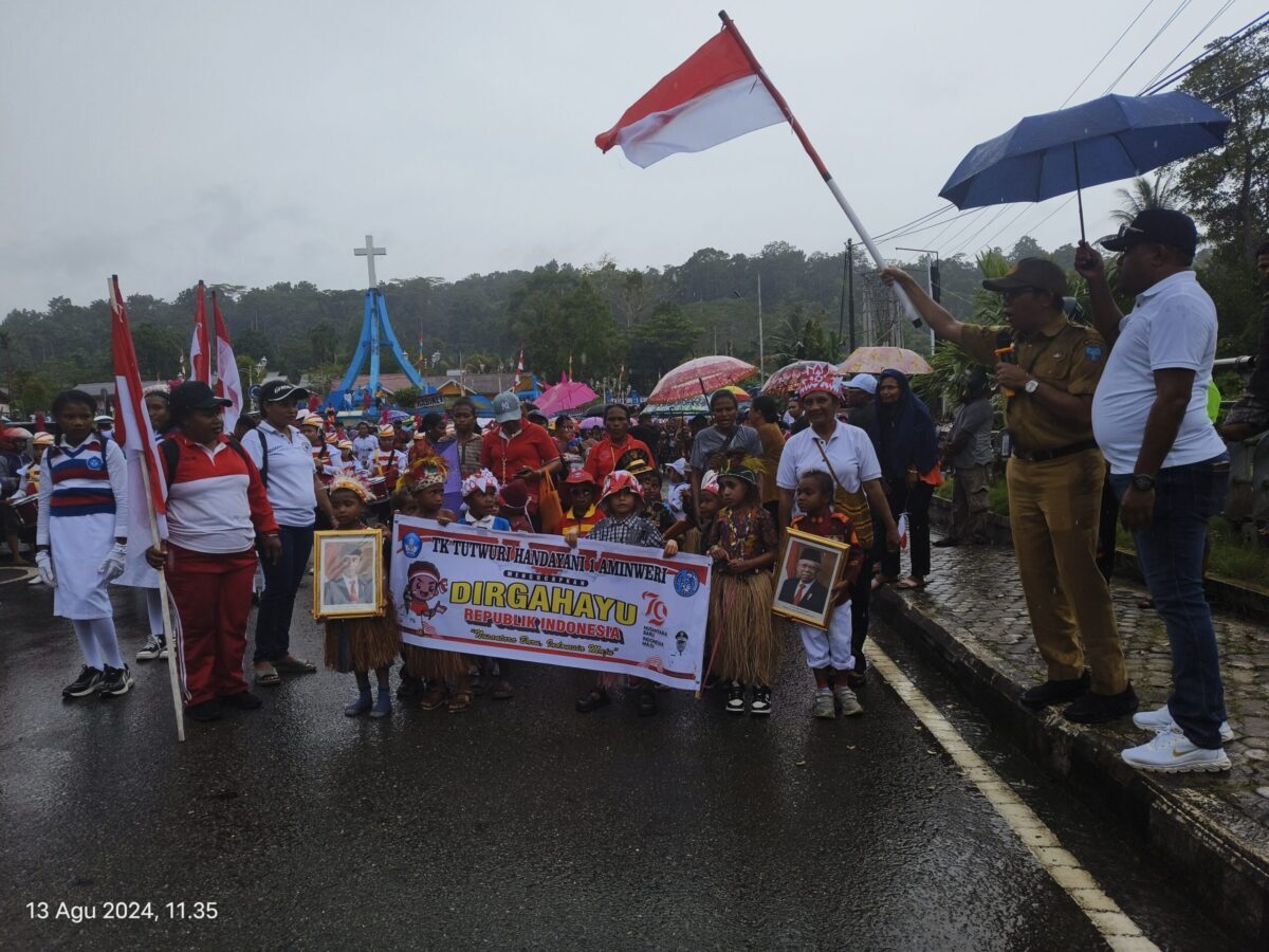 SUPIORI-Ribuan peserta didik dari seluruh tingkat satuan pendidikan, serta warga masyarakat dan umum turun kejalan memeriahkan semarak dan semangat kemerdekaan Indonesia ke 79, dengan mengikuti kegiatan karnaval budaya dan profesi, di Sorendiweri, Kabupaten Supiori, Selasa (13/8).
