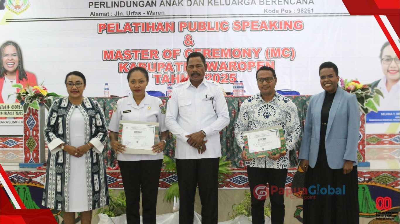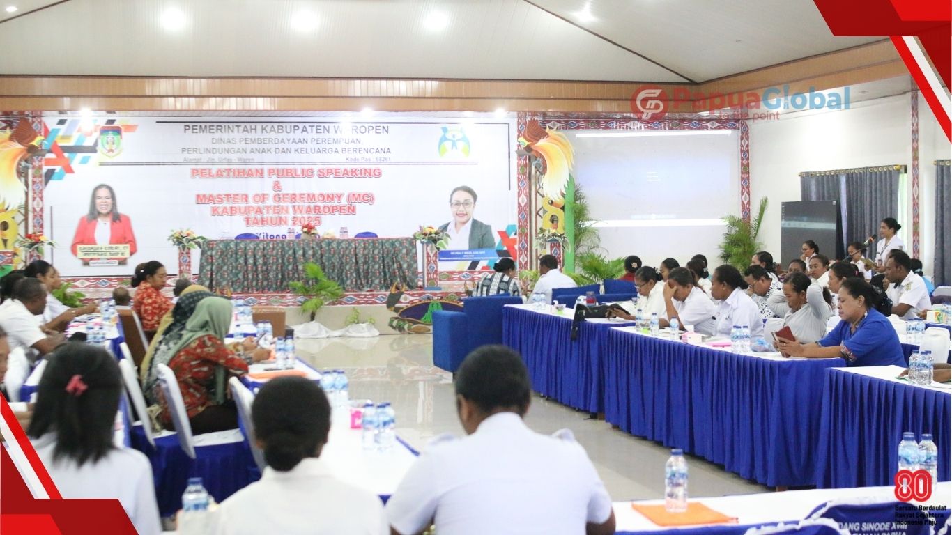 Waropen, PapuaGlobal.com – Dinas Pemberdayaan Perempuan, Perlindungan Anak, dan Keluarga Berencana (DP3AKB) Kabupaten Waropen menggelar pelatihan Public Speaking dan Master of Ceremony (MC) bagi ratusan peserta yang terdiri dari ASN, unsur organisasi wanita, serta Forum Anak. Kegiatan ini berlangsung selama dua hari, 20–21 Agustus 2025, di Gedung Klasis GKI Distrik Urei Faisei.