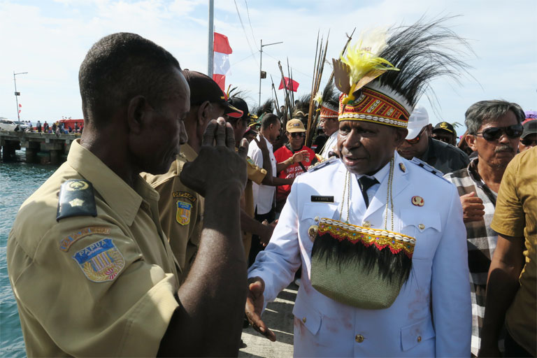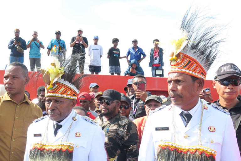 WAROPEN – Bupati Waropen Drs.Fransicus Xaverius Mote,M.Si bersama Wakilnya Yowel Boari Tiba dengan kapal Ekspres Bahari 99 B di Pelabuhan Waren sekitar pukul 15 WIT disambut ribuan warga masyarakat, Rabu (05/03/2025).