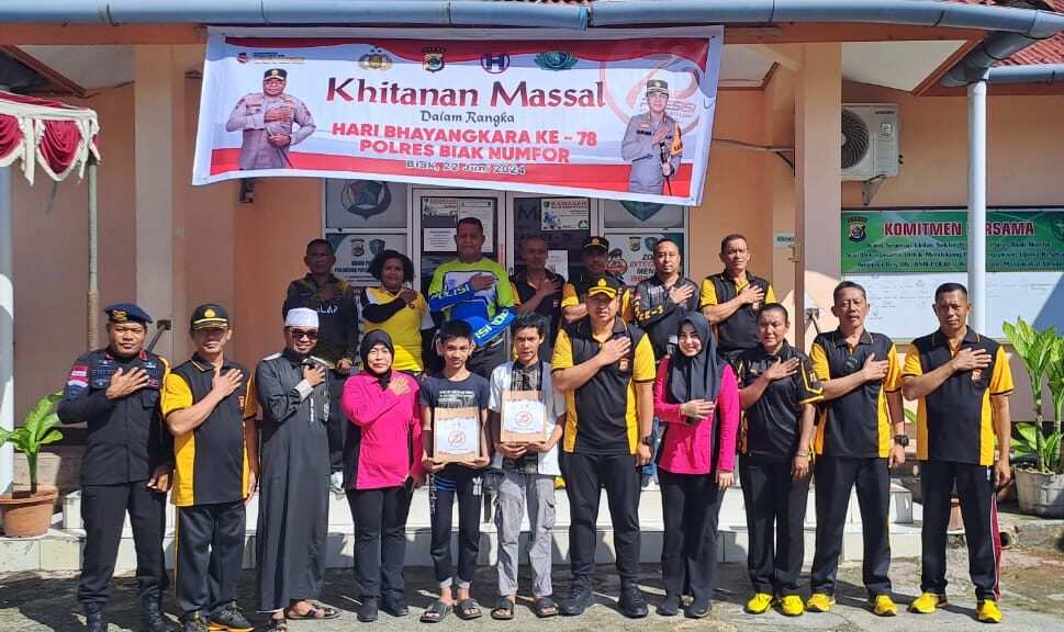 Biak – Kepolisian Resor Biak Numfor melaksanakan kegiatan Bakti Kesehatan Sunatan Massal gratis dalam rangka memperingati Hari Bhayangkara ke-78 tahun 2024 yang bertempat di Poliklinik Polres Biak, Sabtu (22/06/2024).
