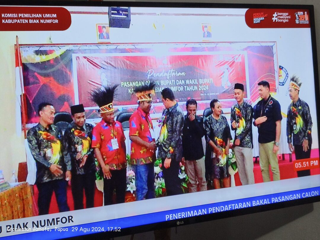 BIAK-Komisi Pemilihan Umum (KPU) Kabupaten Biak Numfor, Kamis (29/8), resmi menerima berkas pendaftaran pasangan bakal calon (bacalon) Bupati dan Wakil Bupati, Herry Ario Naap, S.Si.,M.Pd, dan Kerry Yarangga, SKM.,M.Kes, di Aula Rapat KPU Biak Numfor.