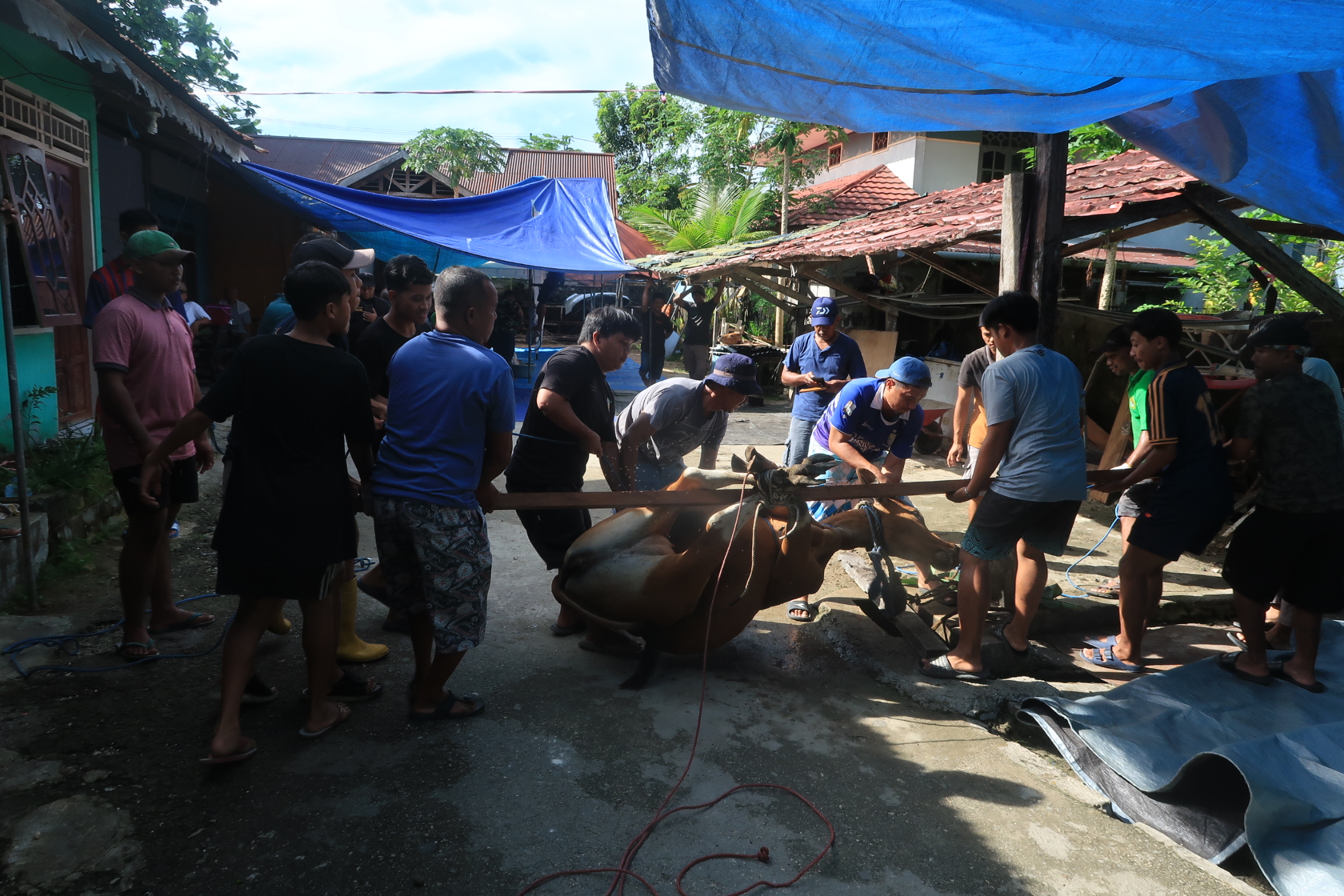 Kami berkesempatan melihat langsung proses pemotongan hewan kurban yang diselenggarakan di Musolah LDII Miftahul Huda. Disana ada 10 ekor sapi dan 2 ekor kambing yang dikurbankan.