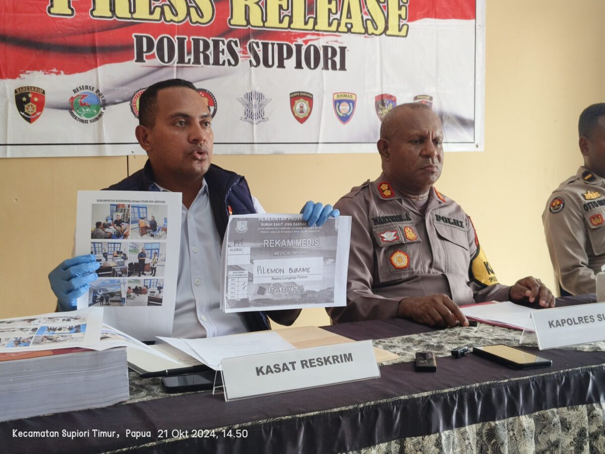 Kapolres Supiori AKBP Marthin W Asmuruf, S.Sos.,MM bersama Kasat Reskrim Polres Supiori IPDA Daniel Z Rumapaidus, SH.,MH saat melakukan press release terkait kasus ini, Senin (21/10) di Mapolres Supiori, mengatakan, PB yang sempat ditangkap oleh Marinir TNI AL di Pulau Mapia, Supiori, karena diduga sebagai anggota intelijen Organisasi Papua Merdeka (OPM).