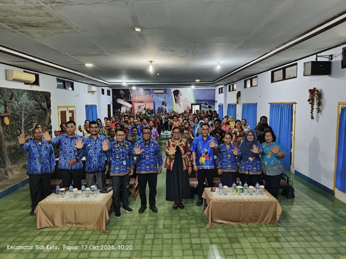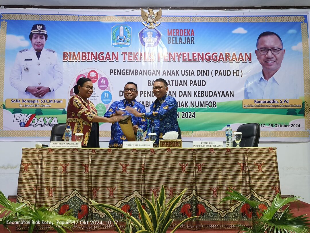 BIAK, 17 Oktober 2024, Papuaglobal.com – Kegiatan Bimbingan Teknis Pengembangan PAUD Holistik Integratif (HI) resmi dibuka di Kabupaten Biak Numfor. Acara ini dihadiri oleh beberapa tokoh penting, termasuk Ruth Naomi Rumkabu, anggota DPR RI sekaligus Ketua Himpaudi Biak Numfor yang baru saja dilantik, Plt Sekda Zakarias Mailoa, dan Kepala Dinas Pendidikan Kamarudin, S.Pd beserta jajaran pejabat Dinas Pendidikan dan Kebudayaan Biak. Peserta bimtek ini terdiri dari para tenaga pendidik dan pengurus PAUD yang tersebar di wilayah Biak Numfor.