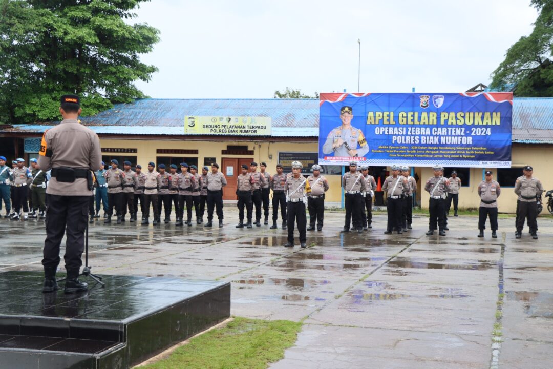 BIAK NUMFOR, Papuaglobal.com – Polres Biak Numfor menggelar Apel Gabungan untuk membuka secara resmi Operasi Zebra Cartenz 2024 di halaman Mapolres Biak Numfor pada Senin pagi, 14 Oktober 2024. Apel tersebut dipimpin langsung oleh Kapolres Biak Numfor AKBP Ari Trestiawan, SIK.,SH.,M.H dan dihadiri oleh unsur Forkopimda, serta Dinas Perhubungan Kabupaten Biak Numfor, Satuan POM TNI, Senkom, Bapenda, serta pejabat utama polres lainnya.