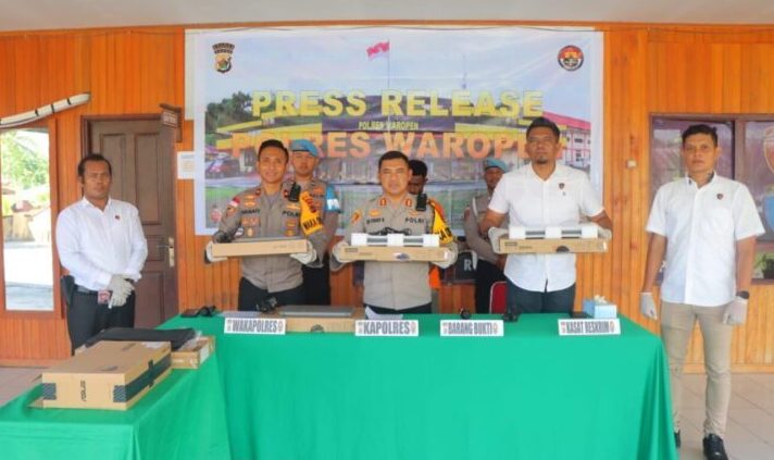 Kapolres Waropen AKBP. Iip Syarif Hidayat, S.H., juga menjelaskan bahwa untuk Barang Bukti yang diamankan yaitu 4 Buah Leptop Lenovo type IdealPad 1 151GL7 Berwarna Cloud Grey.
