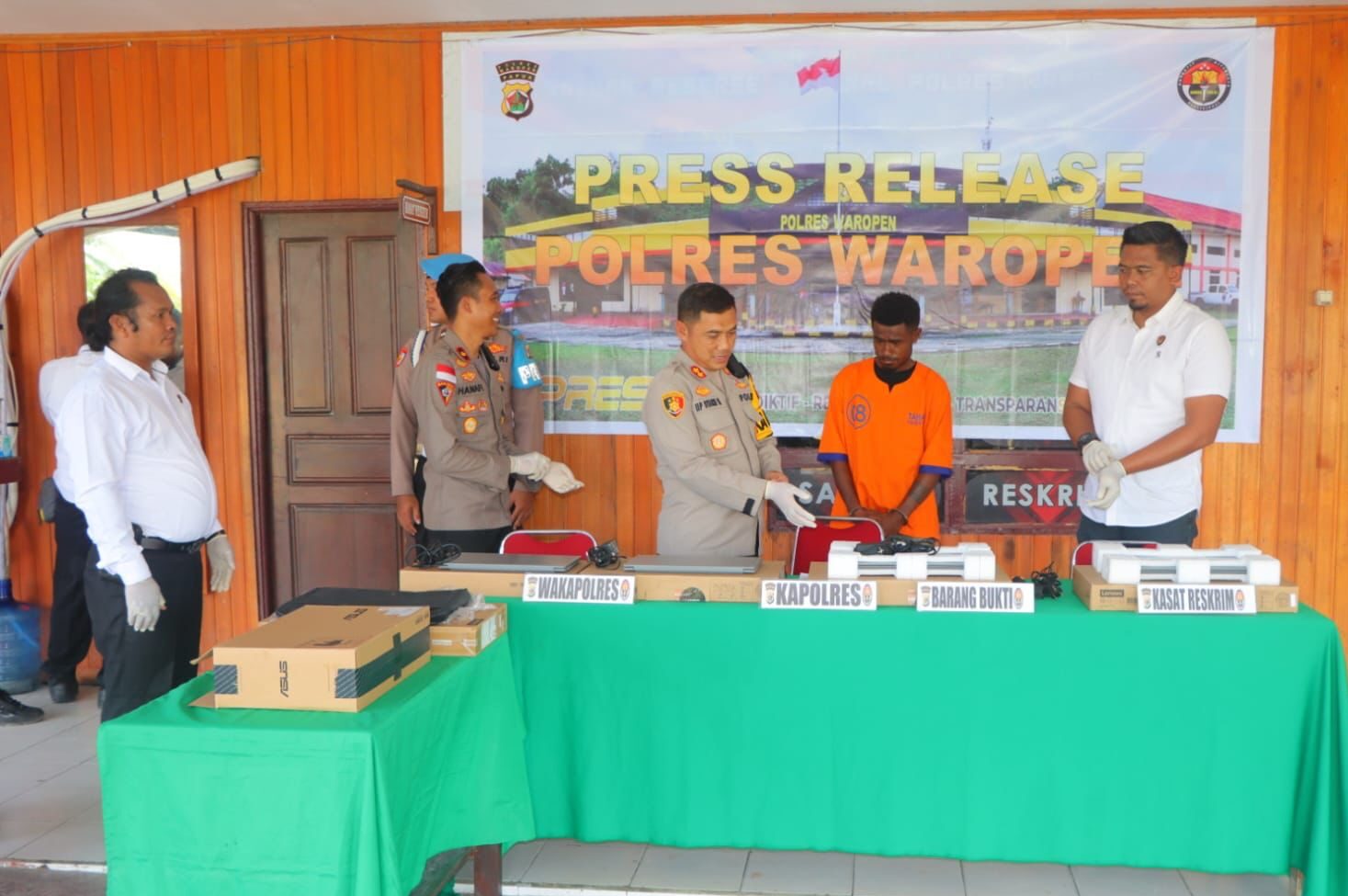 WAROPEN, PapuaGlobal.com-Bertempat di Teras Mapolres Waropen, Kapolres Waropen AKBP. Iip Syarif Hidayat, S.H., didampingi oleh Wakapolres Waropen KOMPOL. M. B. Y. Hanafi, S.H., S.I.K., M.H., Kasat Reskrim Ipda. I Made Budi Dumariawan, S.H., Dan dihadiri oleh ± 45 Orang, melaksanakan Press Release Pengungkapan Tindak Pidana Pencurian 9 Unit Leptop , Senin (14/04/2025).