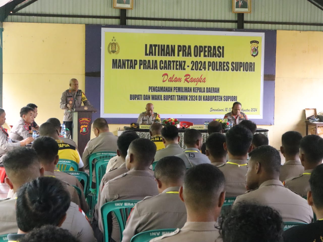 Supiori – Jelang Pilkada, Polres Supiori Laksanakan Latpra Ops Mantap Praja Cartenz – 2024 yang dipimpin oleh Kapolres Supiori, AKBP. Marthin. W. Asmuruf S.Sos., M.M secara resmi membuka Latihan Pra Operasi (Latpraops) Mantap Praja Cartenz – 2024 Di Polres Supiori.
