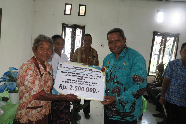 Waropen, PapuaGlobal.com | Pemerintah Kabupaten Waropen melalui Dinas Perindustrian, Perdagangan, Koperasi, UKM, dan Transmigrasi menyalurkan bantuan modal usaha yang bersumber dari dana Otonomi Khusus (Otsus) kepada pelaku koperasi dan pelaku usaha kecil menengah (UKM). Kegiatan berlangsung di ruang pertemuan kantor Dinas Perindagkop pada Kamis, 13 November 2025, dan diserahkan secara simbolis oleh Bupati Waropen, Drs. Fransiskus Xaverius Mote, M.Si.